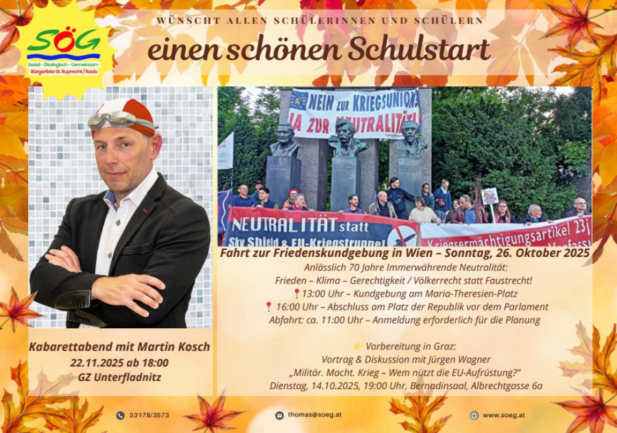 Schülertransport heute: Immer mehr Eltern bringen ihre Kinder selbst zur Schule. Dies führt zu chaotischen Szenen vor den Schulen und gefährdet die Sicherheit der Kinder. Eine bessere Abstimmung zwischen Transportunternehmen, Gemeinde/Land und Eltern ist erforderlich. Als Sofortmaßnahme appellieren wir an die Eltern, Fahrgemeinschaften zu bilden und ihre Kinder nicht bis zur Schultür zu bringen, um den Geist durch Bewegung an der frischen Luft zu fördern. Wir empfehlen auch, die Fa. Aroma in St. Ruprecht von Anlieferungen und Abholungen zwischen 7:15 und 7:45 freizuhalten, um die Sicherheit der Schulwege zu gewährleisten.